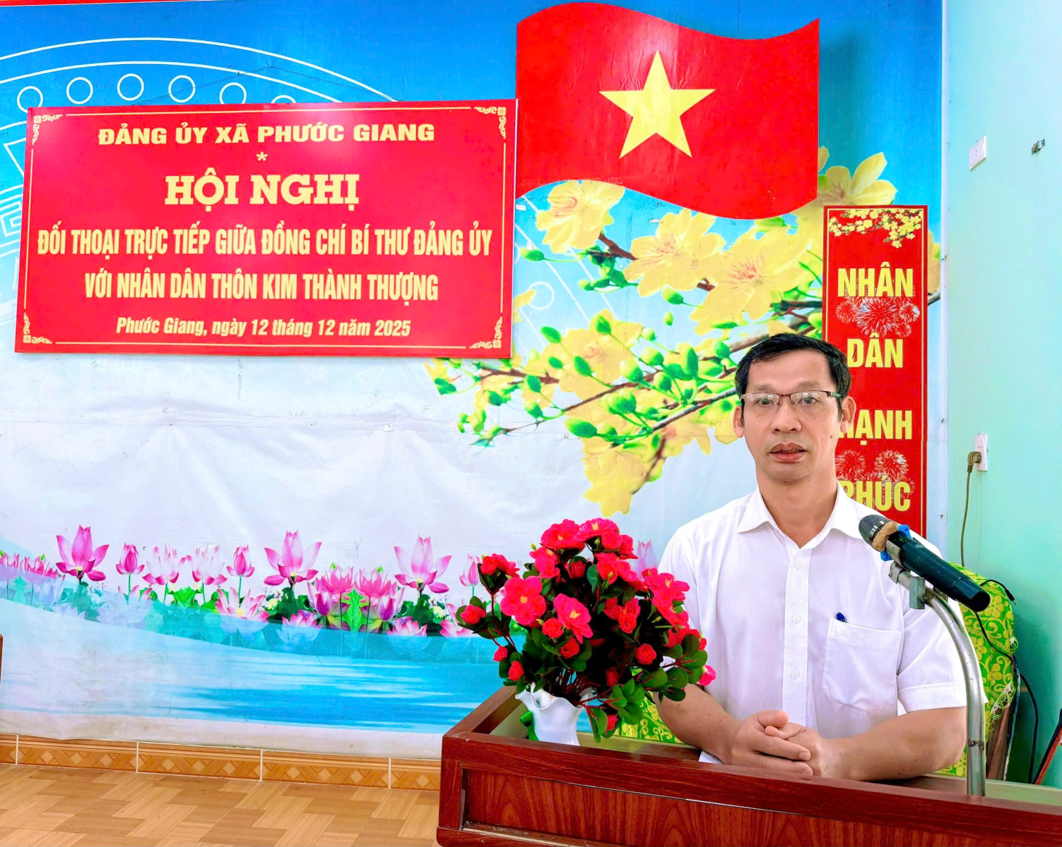 Sáng ngày 12/12/2025, đồng chí Nguyễn Thanh Hà Bí thư Đảng ủy- Chủ tịch Hội đồng nhân dân xã Phước Giang chủ trì Hội nghị đối thoại trực tiếp với Nhân dân thôn Kim Thành Thượng. Dự Hội nghị đối thoại có các đồng chí: Phan Công Huân, Phó Bí thư thường trực Đảng ủy xã; Nguyễn Văn Lễ, Phó Bí thư, Chủ tịch UBND xã; Trương Thị Thúy Vân, Ủy viên Ban Thường vụ, Phó Chủ tịch Hội đồng nhân dân xã; Nguyễn Duy Diễn, Ủy viên Ban Thường vụ Đảng ủy, Phó Chủ tịch Thường trực UBND xã; Nguyễn Thị Kiều Hoanh, Ủy viên Ban Thường vụ, Chủ tịch UBMTTQ Việt Nam xã; Trưởng các Phòng chuyên môn; cơ quan tham mưu, giúp việc Đảng ủy xã; cấp ủy chi bộ, quân dân chính thôn và bà con Nhân dân thôn Kim Thành Thượng