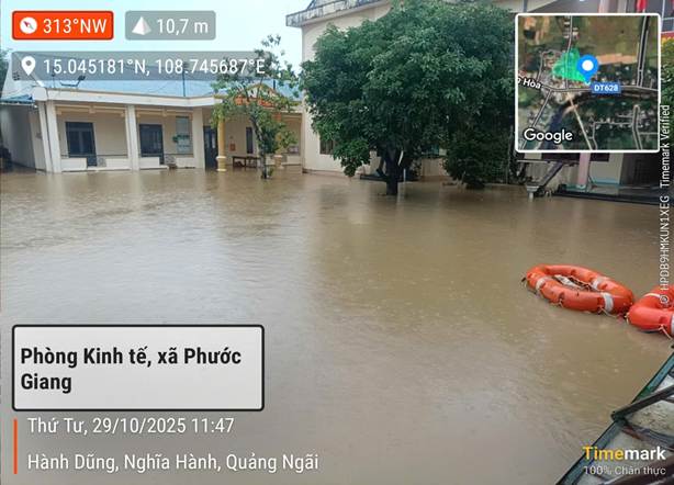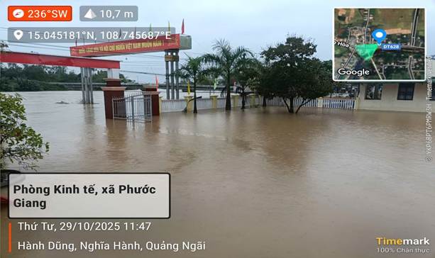 Do ảnh hưởng của áp thấp nhiệt đới, trong tối ngày 28/10 đến sáng ngày 29/10, xã Phước Giang đang mưa rất to, lượng mưa đạt trên 170mm; mực nước sông Phước Giang và các nhánh sông Phước Giang dâng lên nhanh. Mực nước lúc 03 giờ 50 phút ngày 29/10/2025 tại tháp bão lũ Hành Dũng (cũ) mực nước 1,7m, ngập toàn bộ thôn An Hoà, thôn Kim Thành, thôn An Sơn, Phước Lâm; lúc 1 giờ 30 phút tại tháp báo lũ tại cầu mương máng Hành Minh – Hành Nhân, mực nước 1,4m, ngập thôn Phước Lâm, Đông Trúc Lâm, Long Bàn Bắc, Long Bàn Nam, …