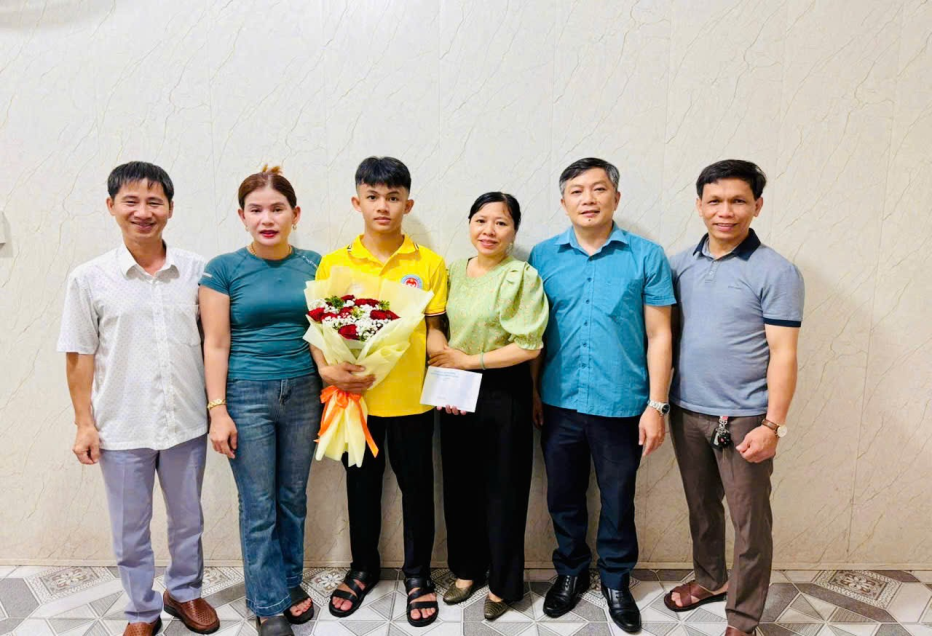 Lãnh đạo xã Phước Giang thăm, chúc mừng và tặng quà cho vận động viên Võ Minh Triết, vừa đoạt huy chương đồng tại giải vô địch cúp kickboxing thế giới năm 2025